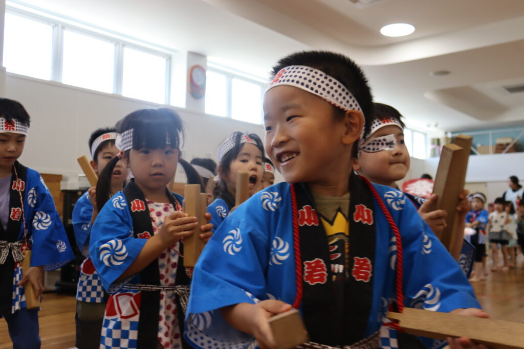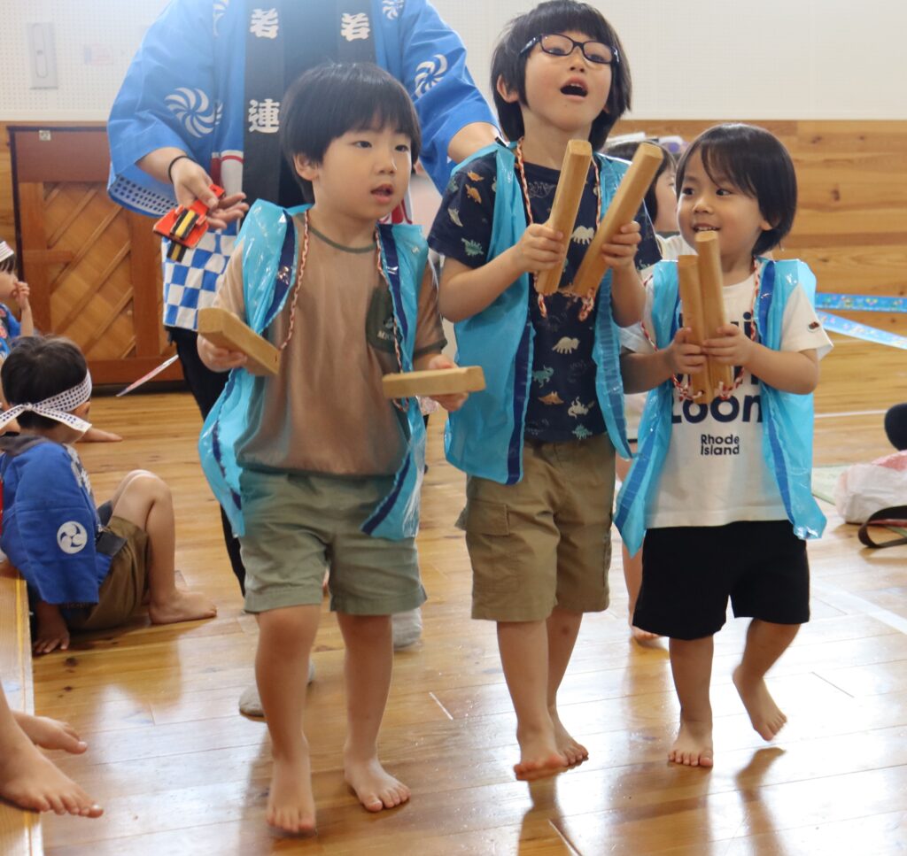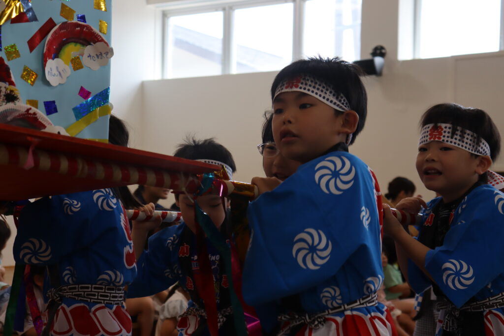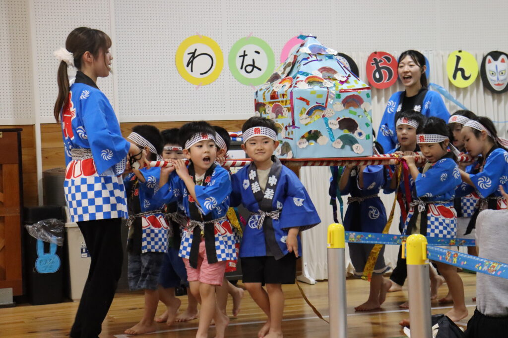 おみこし作りでは、はばたき組がアイディアを出し合い、キラキラのおみこしを作りました。おみこしが始まると、最初は恥ずかしさから小さな声でしたが、回数を重ねると自信がついたようで「わっしょい」「わっしょい」と大きな声が出るようになってきました。異年齢おみこしでは自信満々のはばたき組に影響され、あおぞら組とそよかぜ組も拍子木やうちわを持って元気に園内を練り歩き、お祭りの雰囲気を楽しみました。