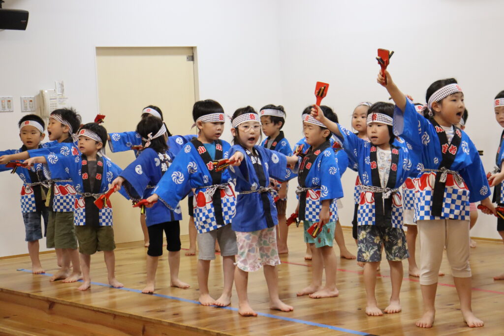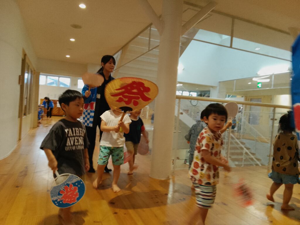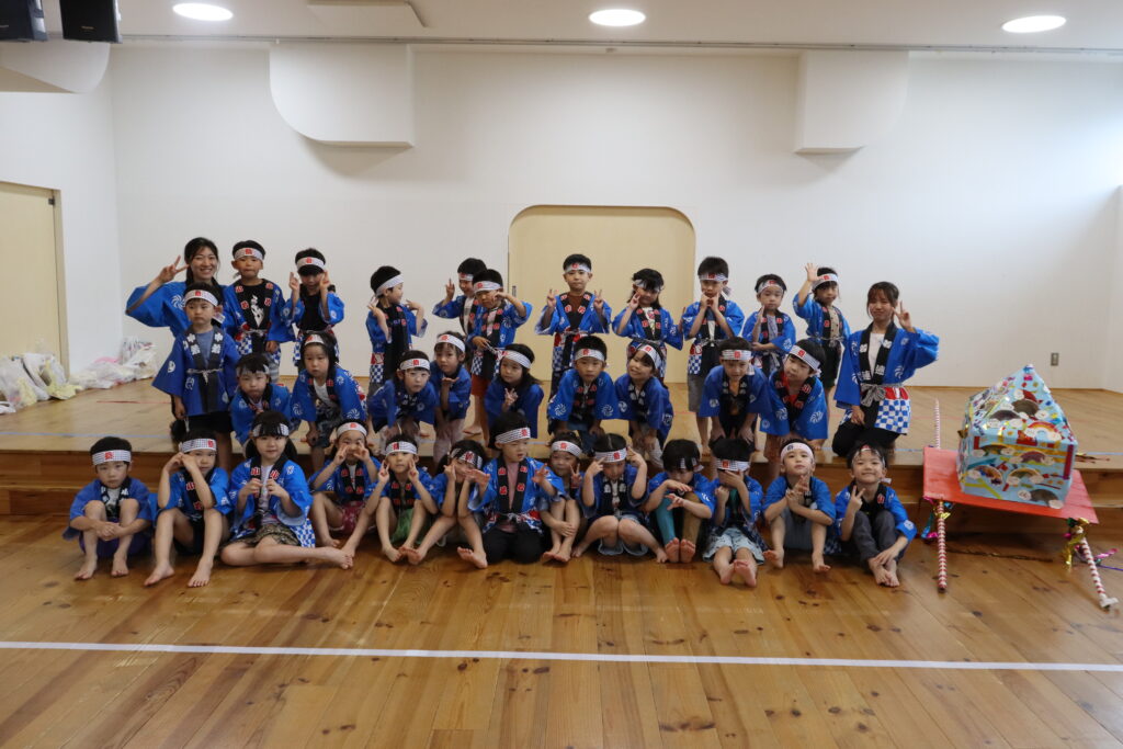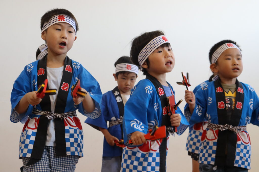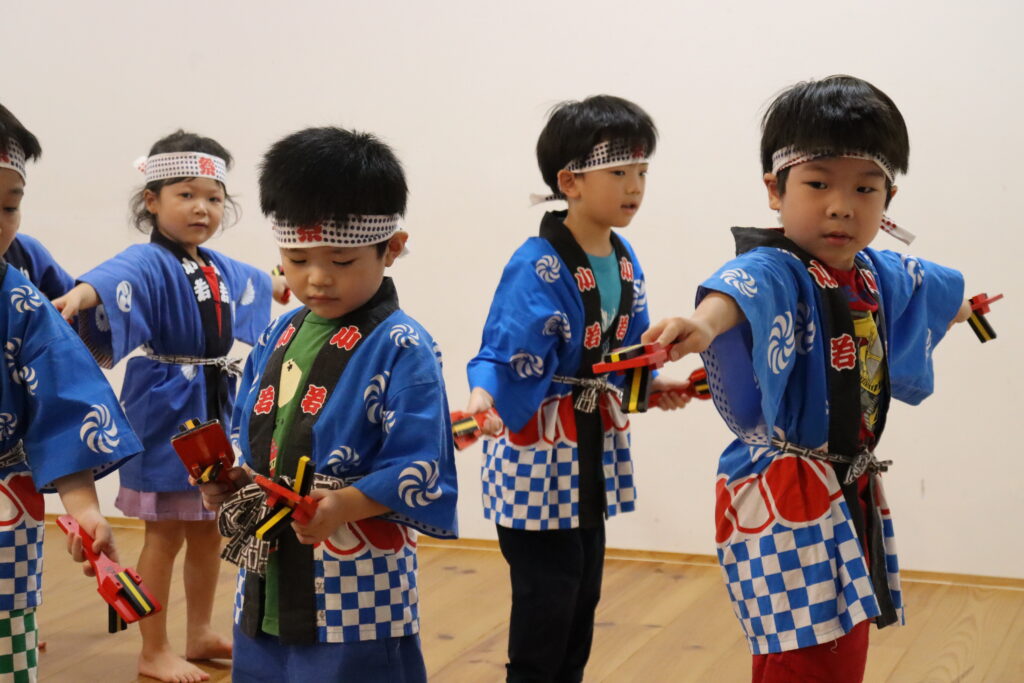 おみこし作りでは、はばたき組がアイディアを出し合い、キラキラのおみこしを作りました。おみこしが始まると、最初は恥ずかしさから小さな声でしたが、回数を重ねると自信がついたようで「わっしょい」「わっしょい」と大きな声が出るようになってきました。異年齢おみこしでは自信満々のはばたき組に影響され、あおぞら組とそよかぜ組も拍子木やうちわを持って元気に園内を練り歩き、お祭りの雰囲気を楽しみました。