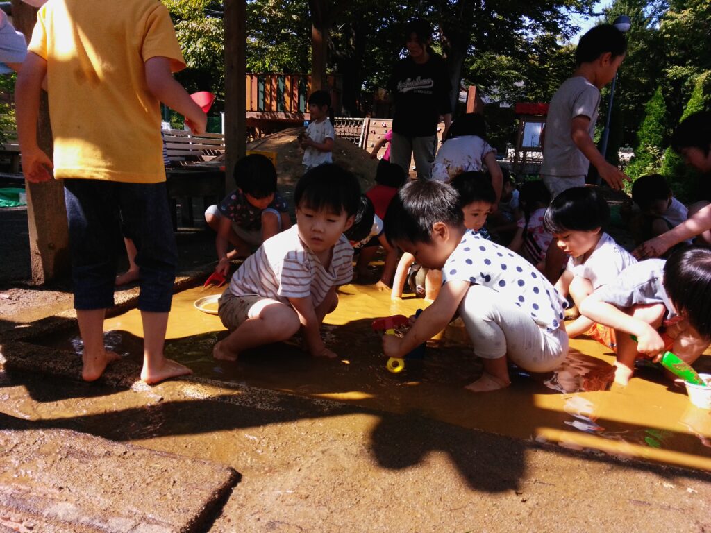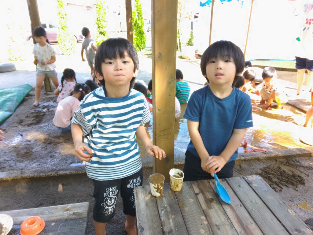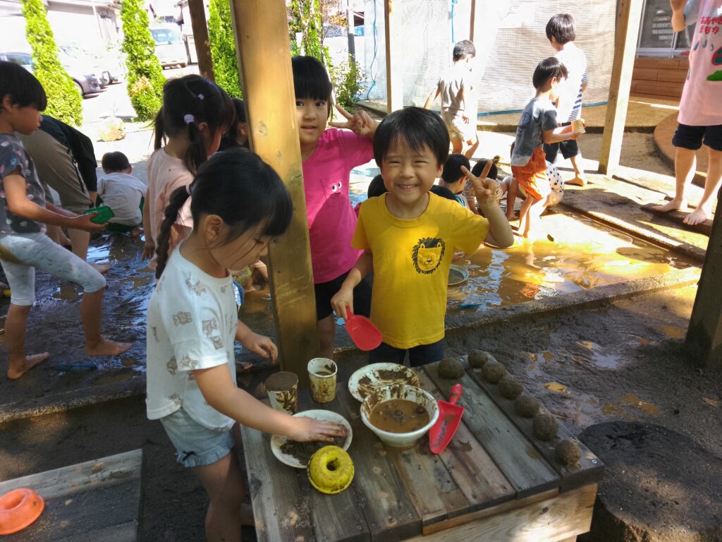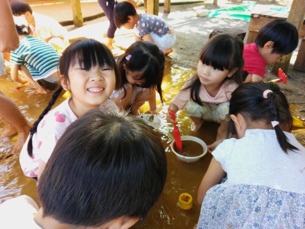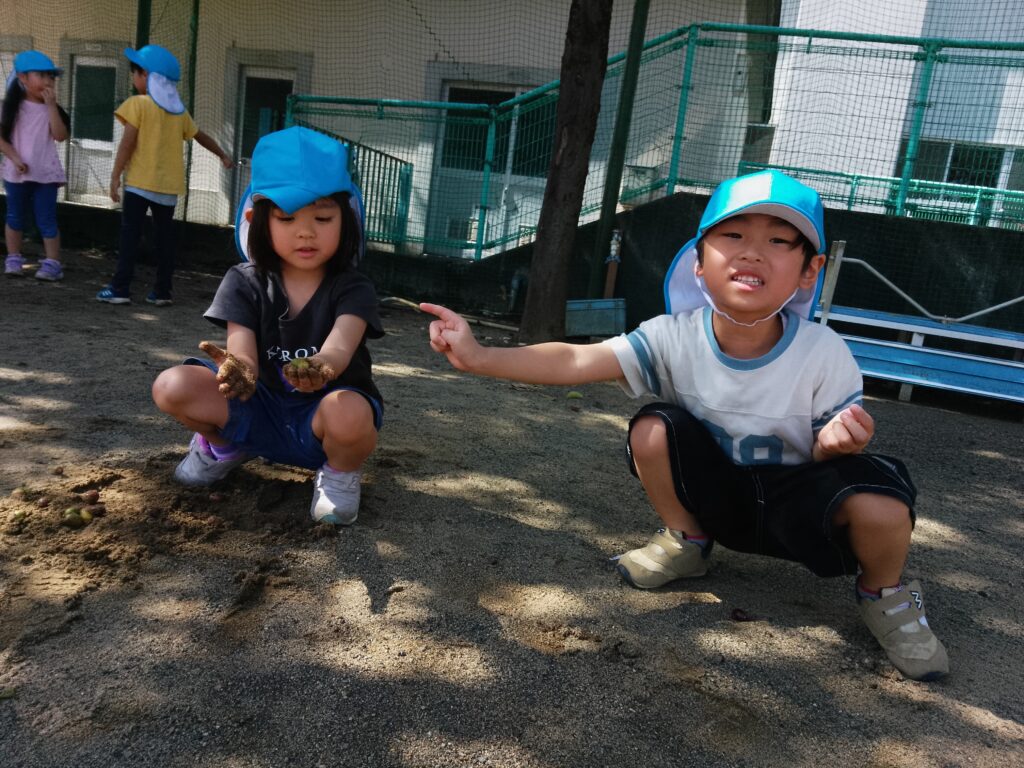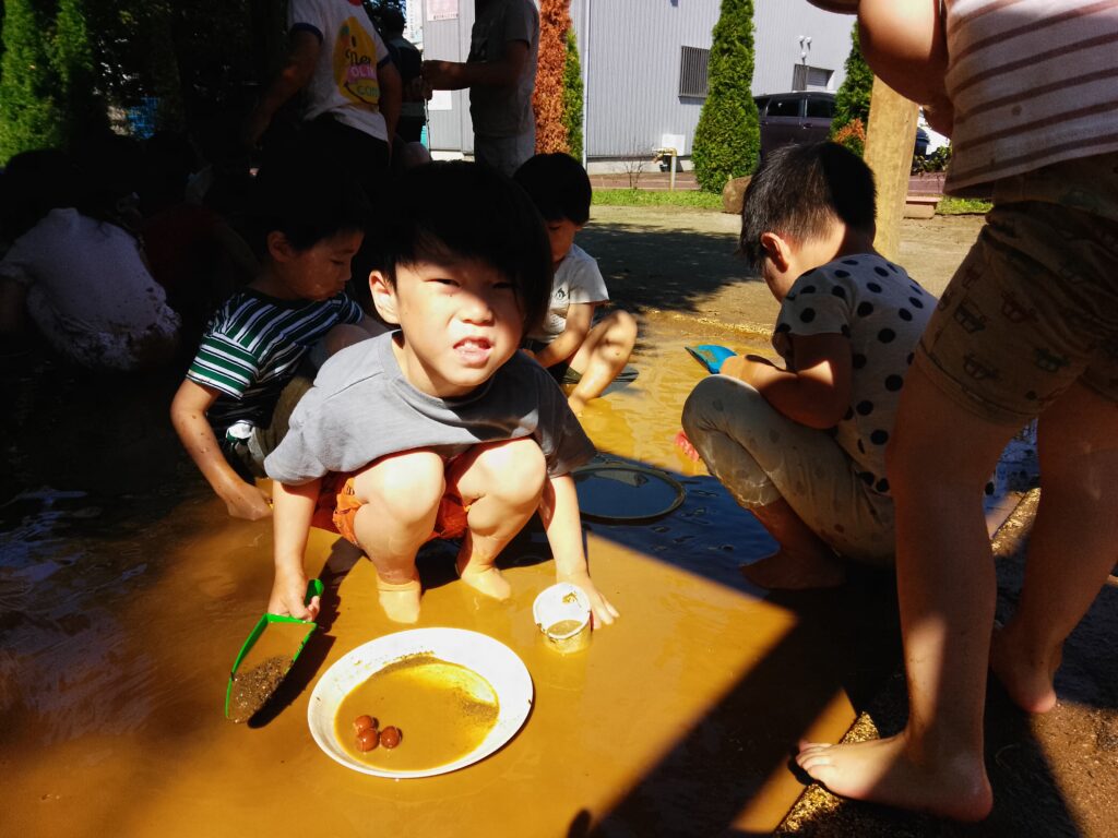 どろんこあそびをする前に、子どもたちに「なにか必要な道具はある?」と聞いたら「スコップ」「ダンボールの的」など様々な意見が出る中で「拾ったどんぐり」という子がいました。みんなで集めたどんぐりも用意すると、泥のご飯に混ぜて料理をしたりどろんこの中に隠しどんぐり探しゲームをしたりして遊びました。広い泥の中から発掘した際の「あった!」はとても笑顔が輝いていました。