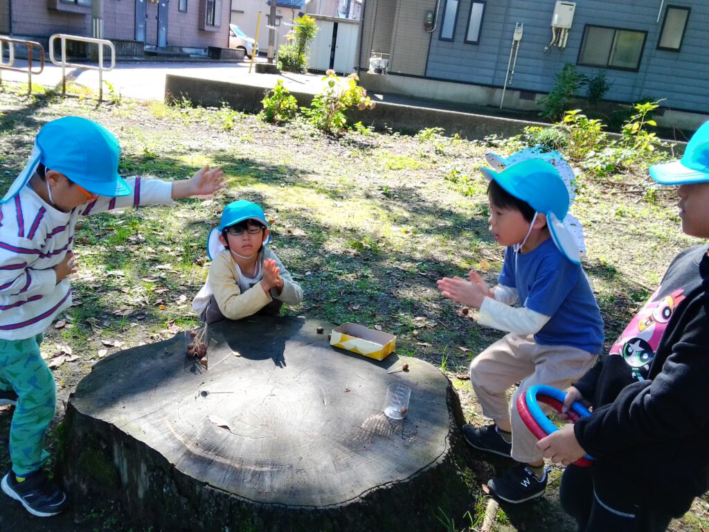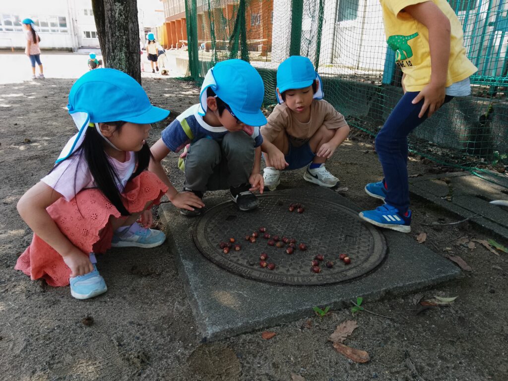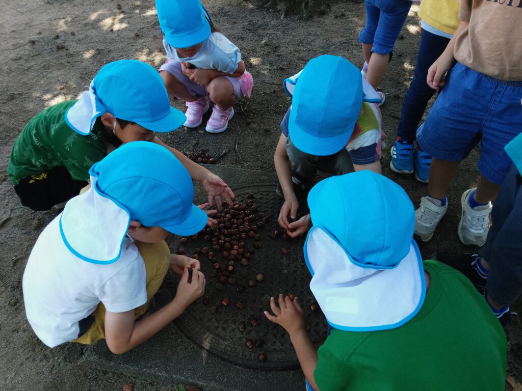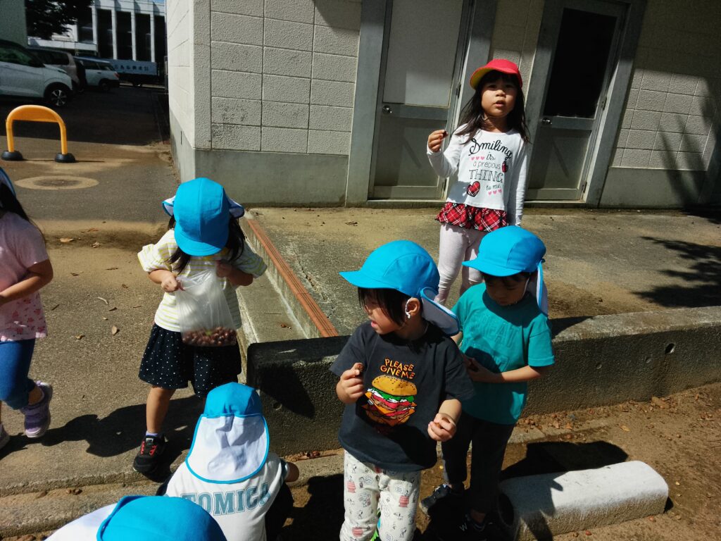 ウォークウィークが始まり、過ごしやすい気温となってきたため久しぶりに新町小学校へ行きました。途中車通りの多い信号では、2列から4列になり素早く渡る姿に成長を感じました。グラウンドに着くと、どんぐりを見つけた子どもたち。「持って帰りたい!」という声が多く、みんなが夢中になって集めていました。どんぐりの大きさや色や形の違いに気づき、「ネコみたい」「これ黒いから特別なんだよ」と思い思いのどんぐりを見つけることができたようですよ。
