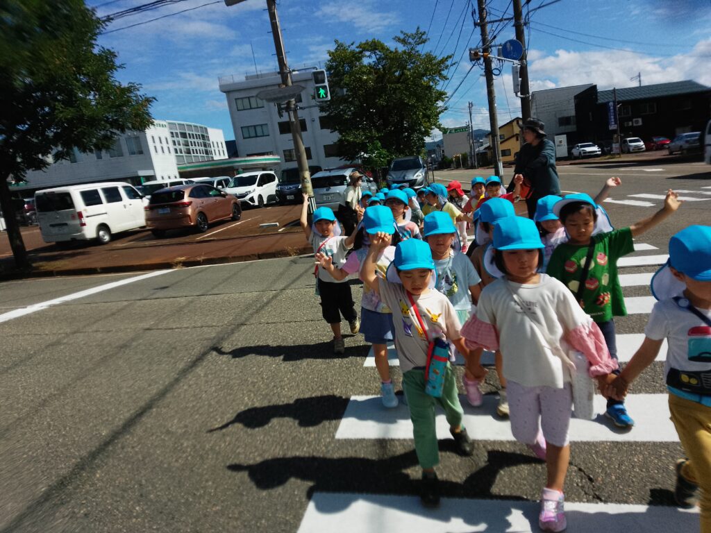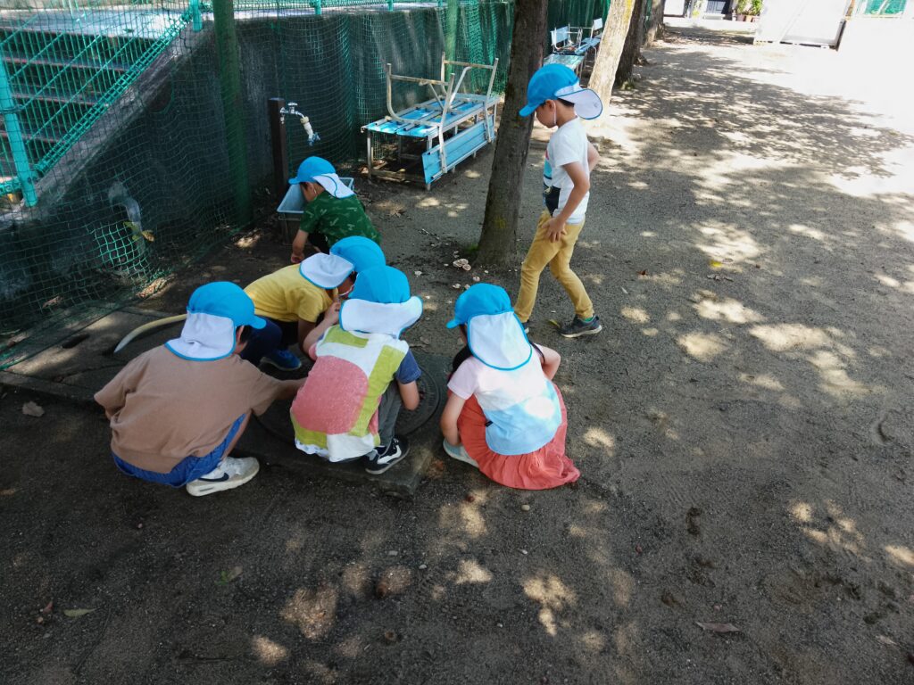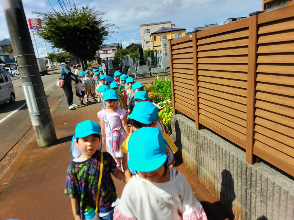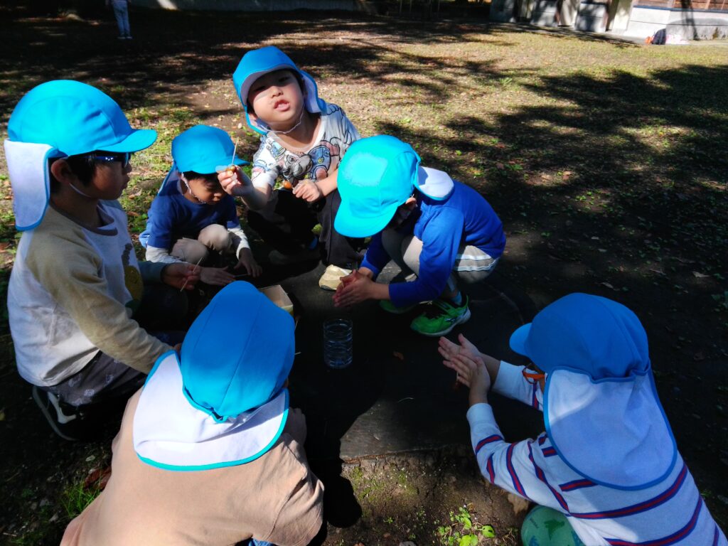 ウォークウィークが始まり、過ごしやすい気温となってきたため久しぶりに新町小学校へ行きました。途中車通りの多い信号では、2列から4列になり素早く渡る姿に成長を感じました。グラウンドに着くと、どんぐりを見つけた子どもたち。「持って帰りたい!」という声が多く、みんなが夢中になって集めていました。どんぐりの大きさや色や形の違いに気づき、「ネコみたい」「これ黒いから特別なんだよ」と思い思いのどんぐりを見つけることができたようですよ。
