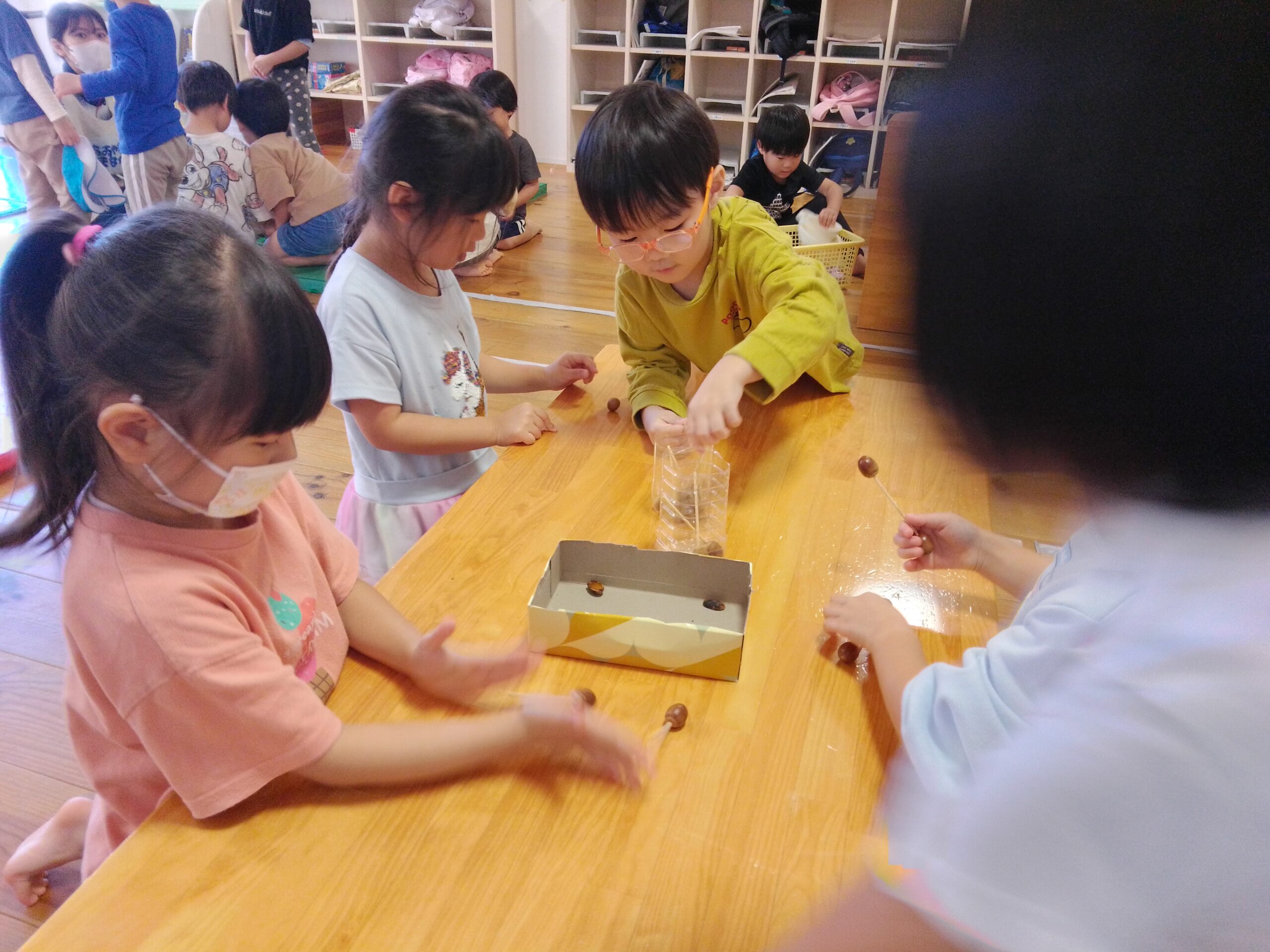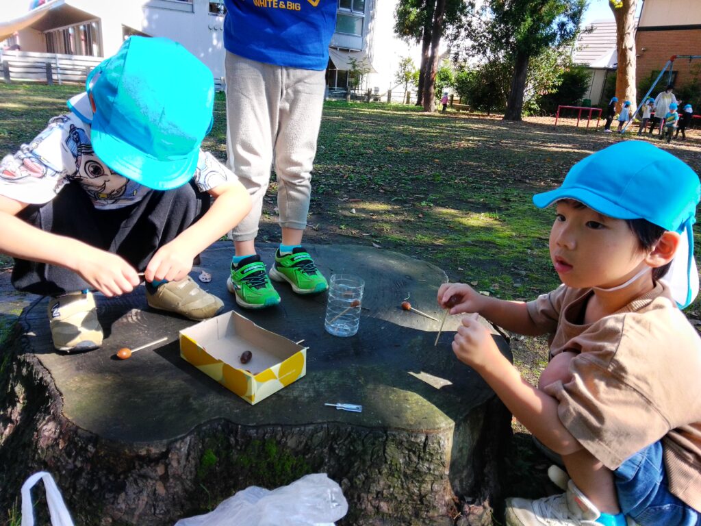 「どんぐりコマ作って」と子どもからのリクエスト。作って近くの公園に遊びに行った際出して見ると興味津々の子どもたち。「うまく回らない」「ちょっと早く手を動かしたら?」など試行錯誤しながら回すことを楽しんでいました。室内でも、机の上で挑戦していました♪