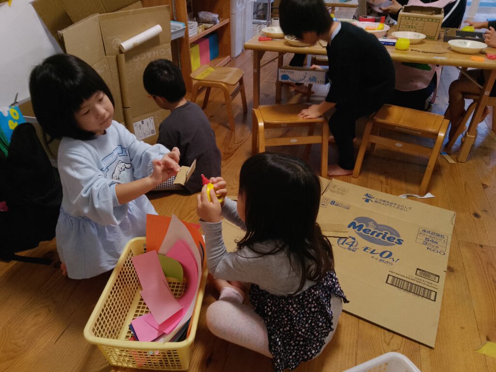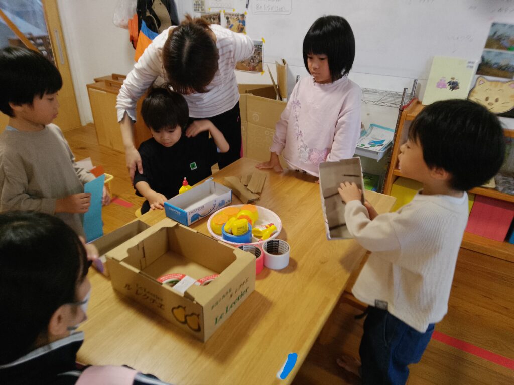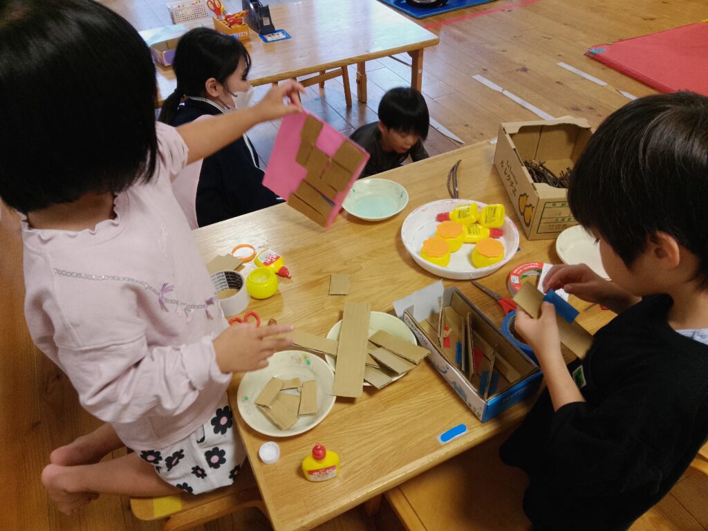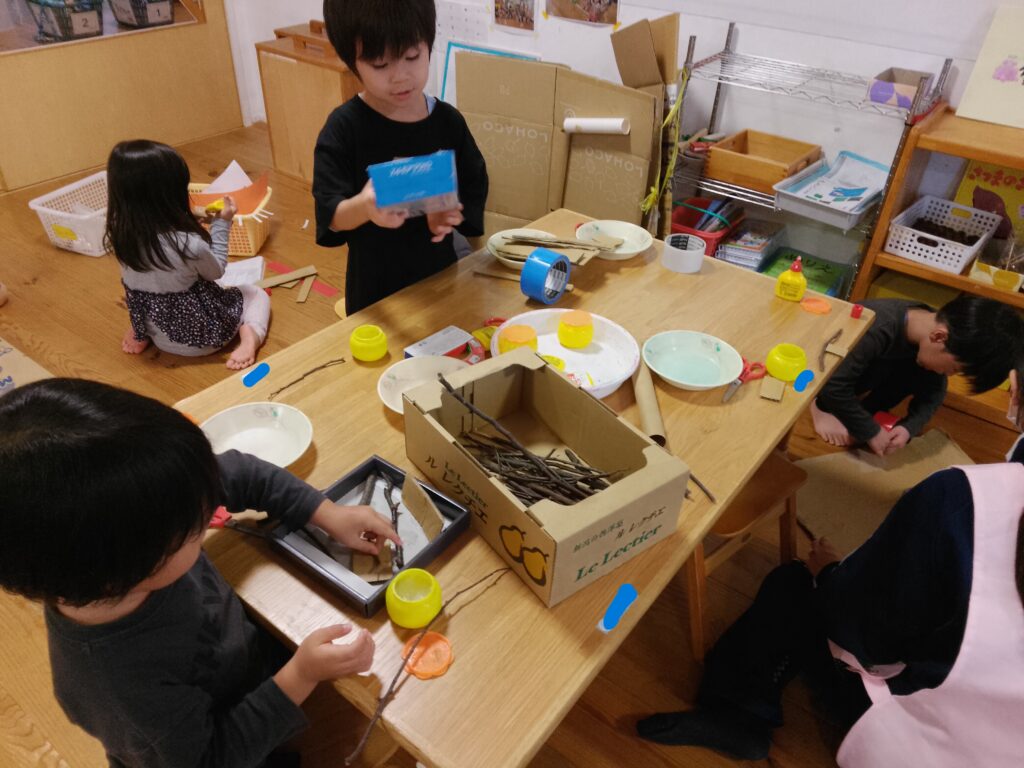 神社で小枝をたくさん拾ってきて、ダンボールに貼り付けどんぐり迷路を作りました。小枝だけでなく、ペーパー芯や厚紙なども使いどんぐりが転がる道を考えながら一生懸命貼り付けていました。「こっちに貼った方がいいんじゃない?」「こっち押さえてて」など、協力しながら様々な作品が出来上がっていましたよ。