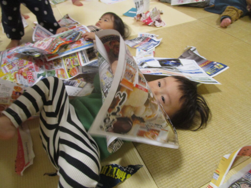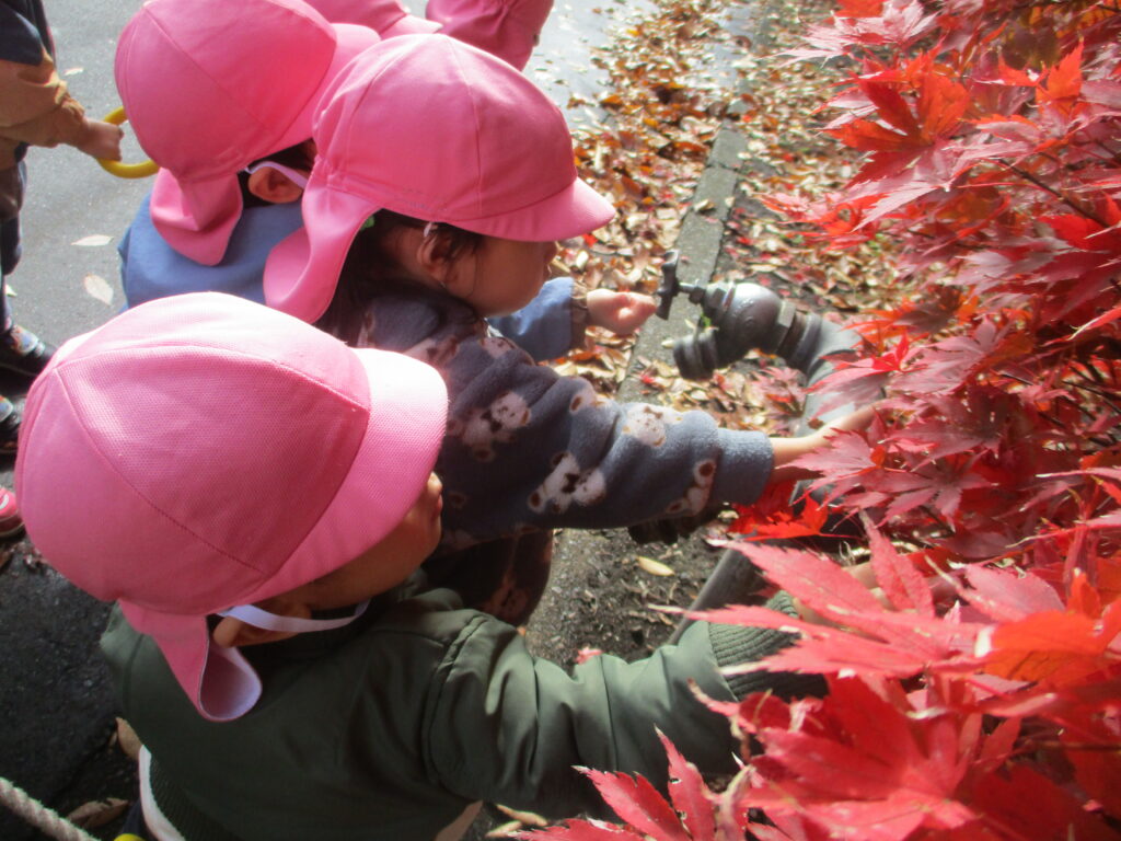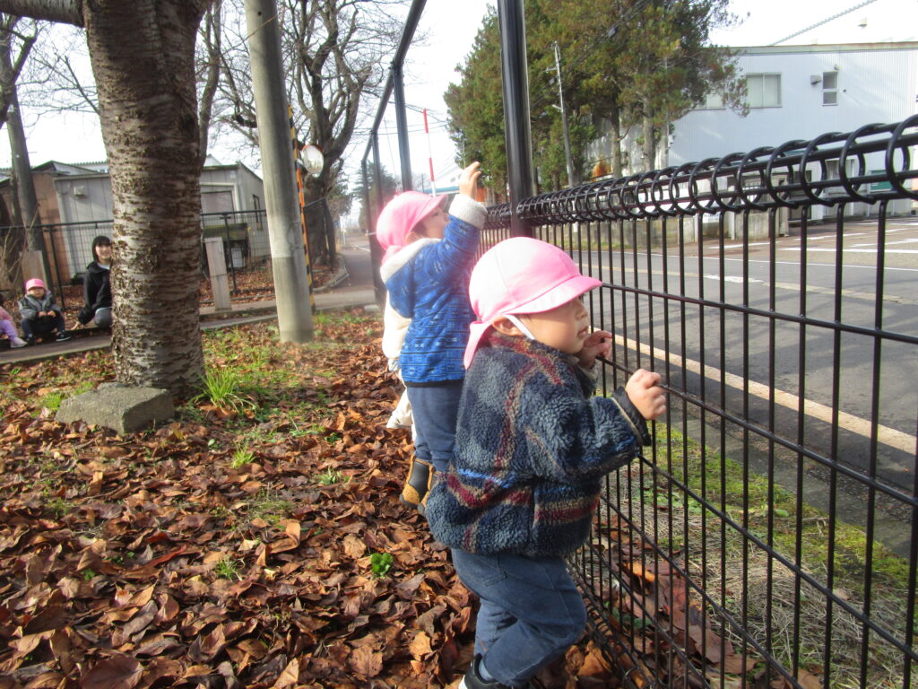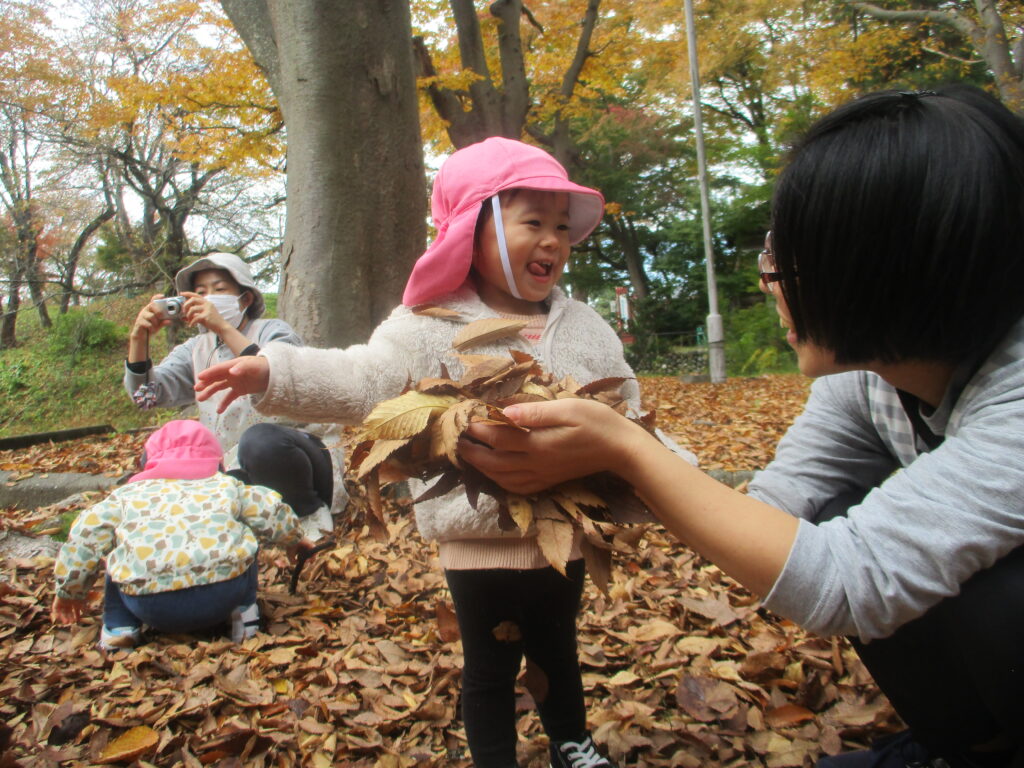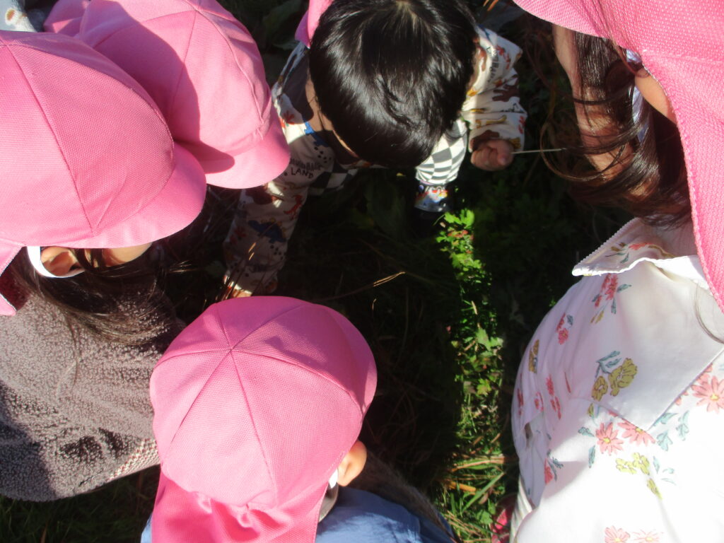 戸外遊びが大好きなさえずり組。晴れた日には神社や土手へ行ったり、近所を散歩したりと出会いや体験を楽しんでいます。戸外では落ち葉や枝などの自然物にもたくさん触れました。豊かな心でいろいろなものを見つめ、五感で感じながら好奇心いっぱいに探索をしています。見つけたものや感じたことを保育者や友だちに嬉irukana~しそうに伝える姿が見られます。