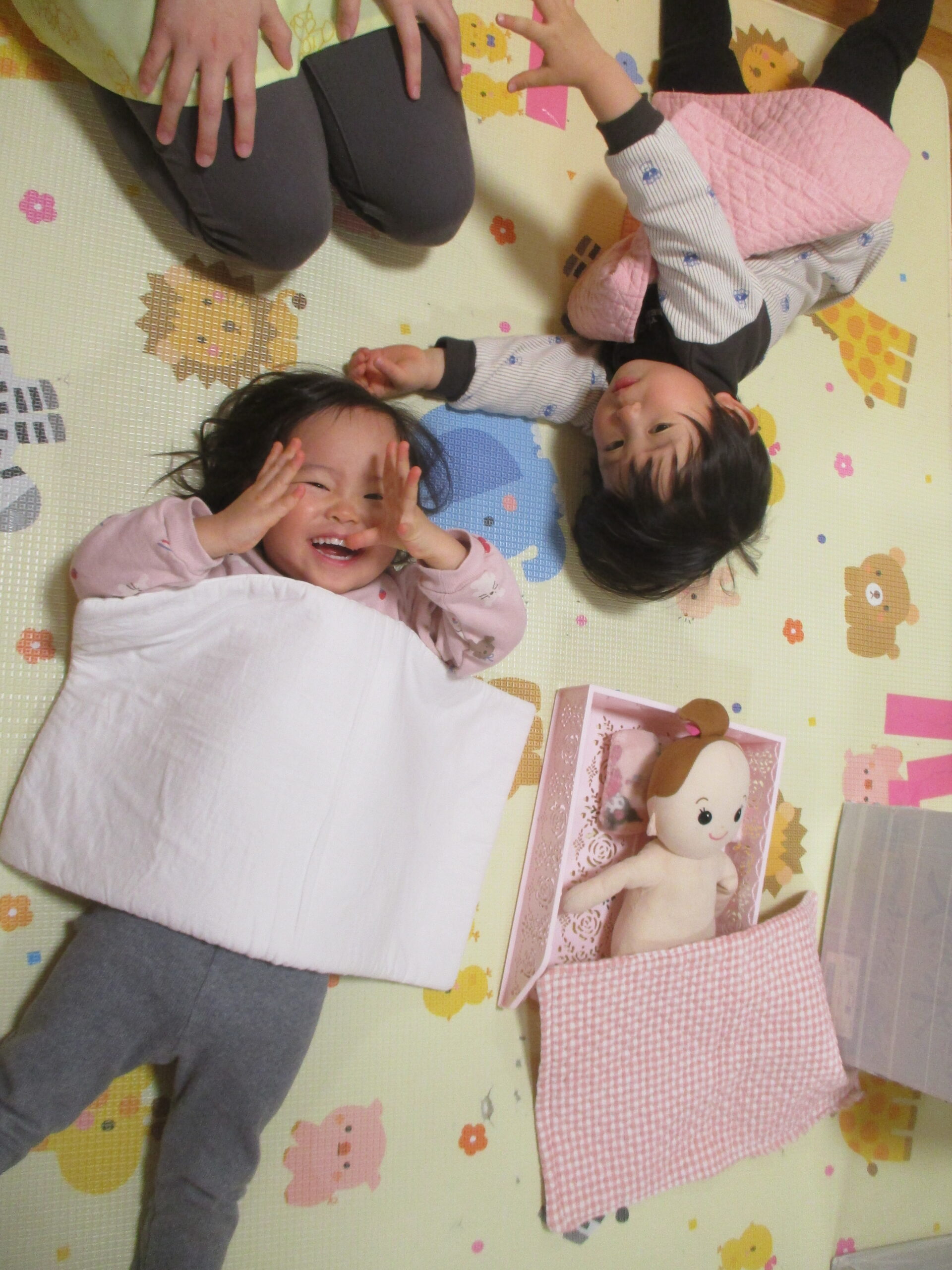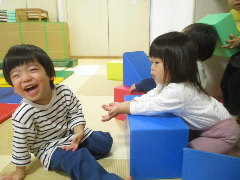 自分の好きな遊びや興味ある遊びを見つけ、遊びを探求する姿が見られます。おままごとやお店屋さんごっこなど、友だちと同じ遊びを楽しみ、遊びの輪が広がっています。友だちと「どうぞ」や「ありがとう」などのやり取りをする場面や「○○ちゃん」と名前を呼ぶ姿も見られ、友だちと遊ぶ楽しさを感じています。
