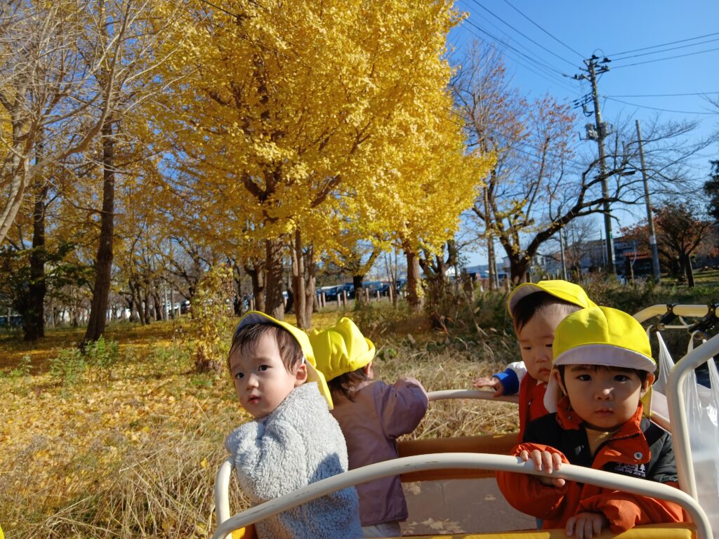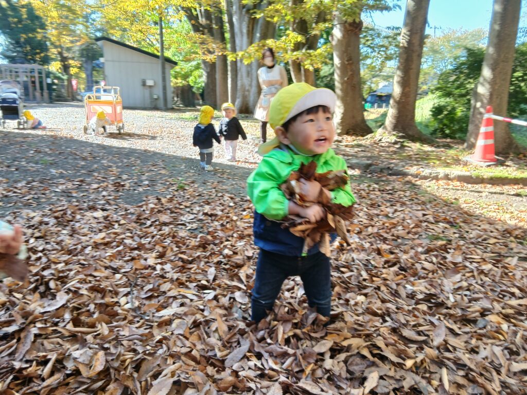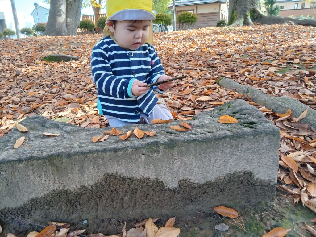 天気の良い日は子どもたちも大好きな戸外へ出かけました。金峯神社の敷地内に枯れ葉が沢山落ちている場所があったり、ご近所にはイチョウの木や柿の木があったりと秋らしい景色が広がっており子どもたちも興味津々な様子でした!枯れ葉の上を駆け抜けて、カサカサという音を立ててみたり枯れ葉や小枝を拾って探索したりと秋らしい自然の中を思い思いに楽しんでいましたよ♪
