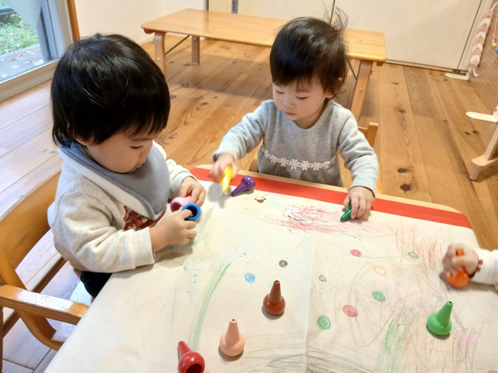 お絵描きでは、みんなで大きな紙を囲みクレヨンで点や線を沢山描きました!トントントンと音を立てながら描いたり線を描いたり紙にうまく線がかけると”見て見て‼”と言うような表情で保育者に教えてくれましたよ。