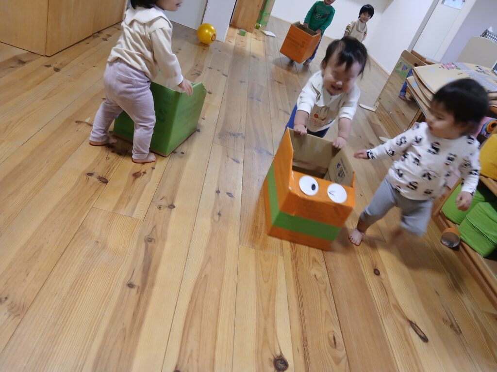 身体を動かす遊びでは、足を上げてはしごを慎重に跨いだり、音楽に合わせてダンスをしたりしています!保育者の踊りを手本に手を伸ばして踊ったり、足踏みしたりいろいろな動きをしながら楽しく踊っています♪ダンボール箱押しも継続してお気に入りで、みんなで競争をしたり個々のペースで探索に出かけたりと足腰を使いながら遊んでいます。