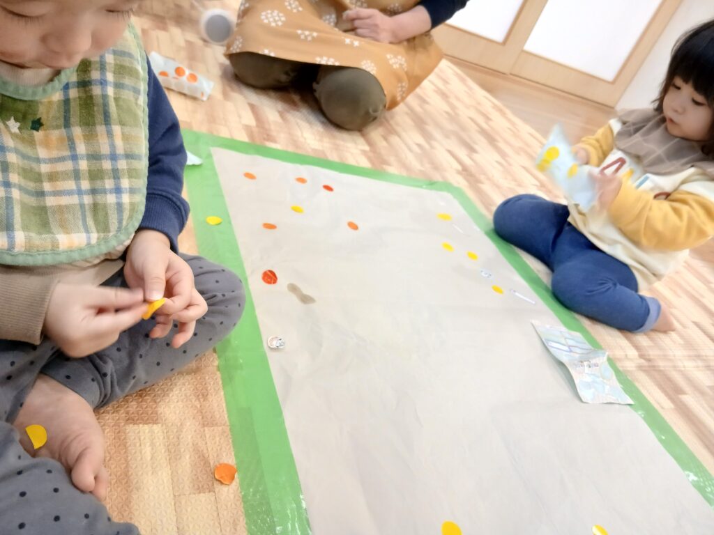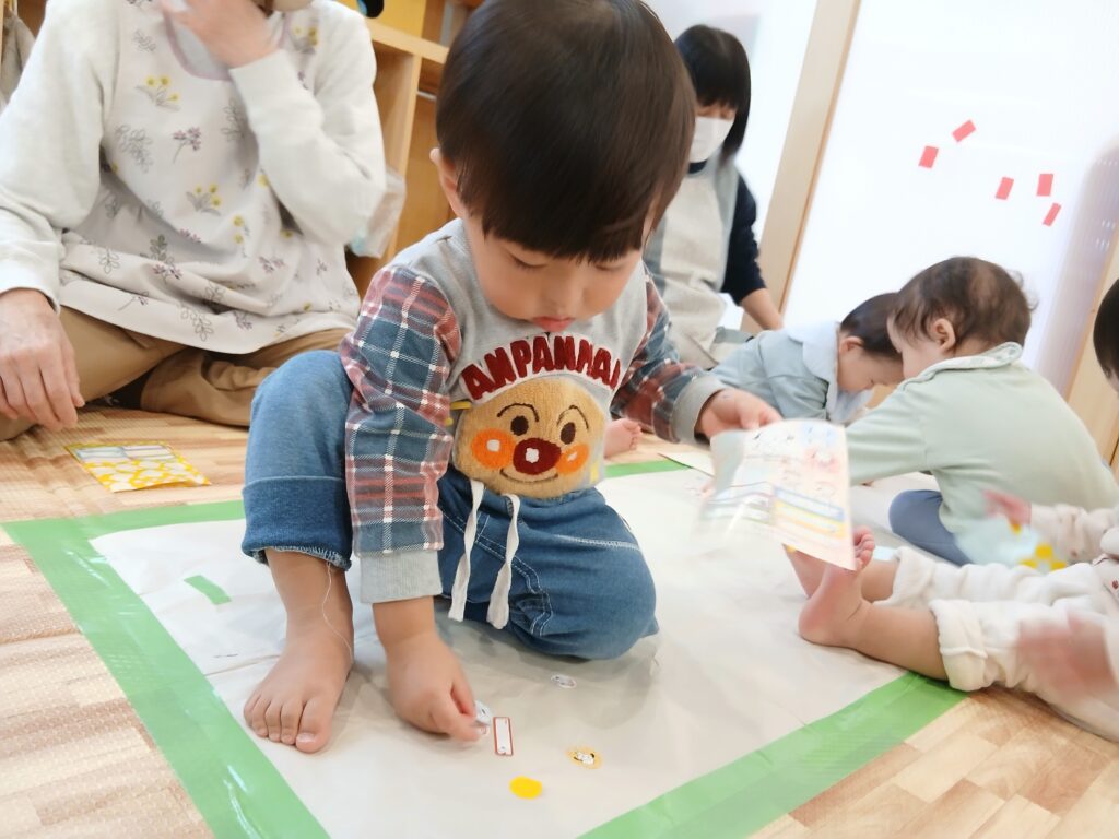 シール貼りもひとりで集中して貼ったり大きな紙にみんなで貼ったりして楽しみました。台紙からそっとシールを紙に貼る子、保育者が手渡したシールを貼ってみる子等それぞれのペースで指先を使う遊びを楽しんでいます。