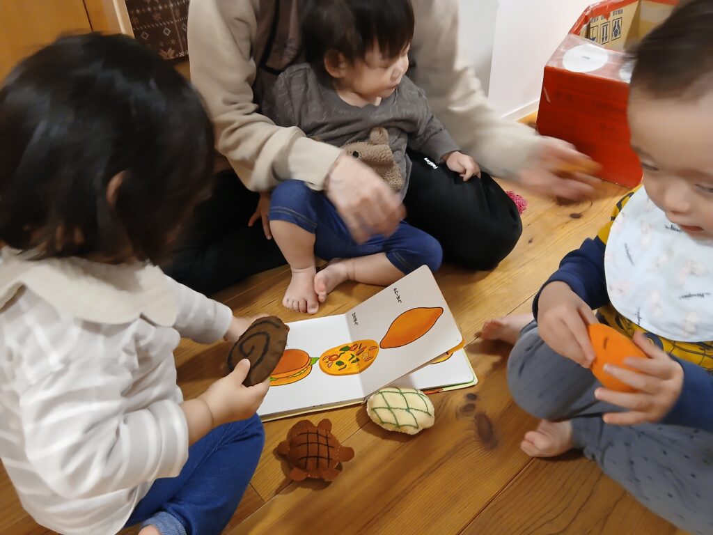 絵本読み、身体を動かす遊び等色々な遊びを楽しんでいます!絵本が大好きな子どもたち。お気に入りの本を”読んで”と持ってきて保育者の膝で絵本を読んでもらい、満足そうです。絵本に出てくる”ぽんぽん””おいでおいで”等リズミカルな言葉を真似る子も増えてきていますよ。この頃は、言葉が少しずつ出始めたり仕草で伝えようとしたりする姿がよく見られたりと、子どもたちとより一層やりとりを楽しめるようになってきました!