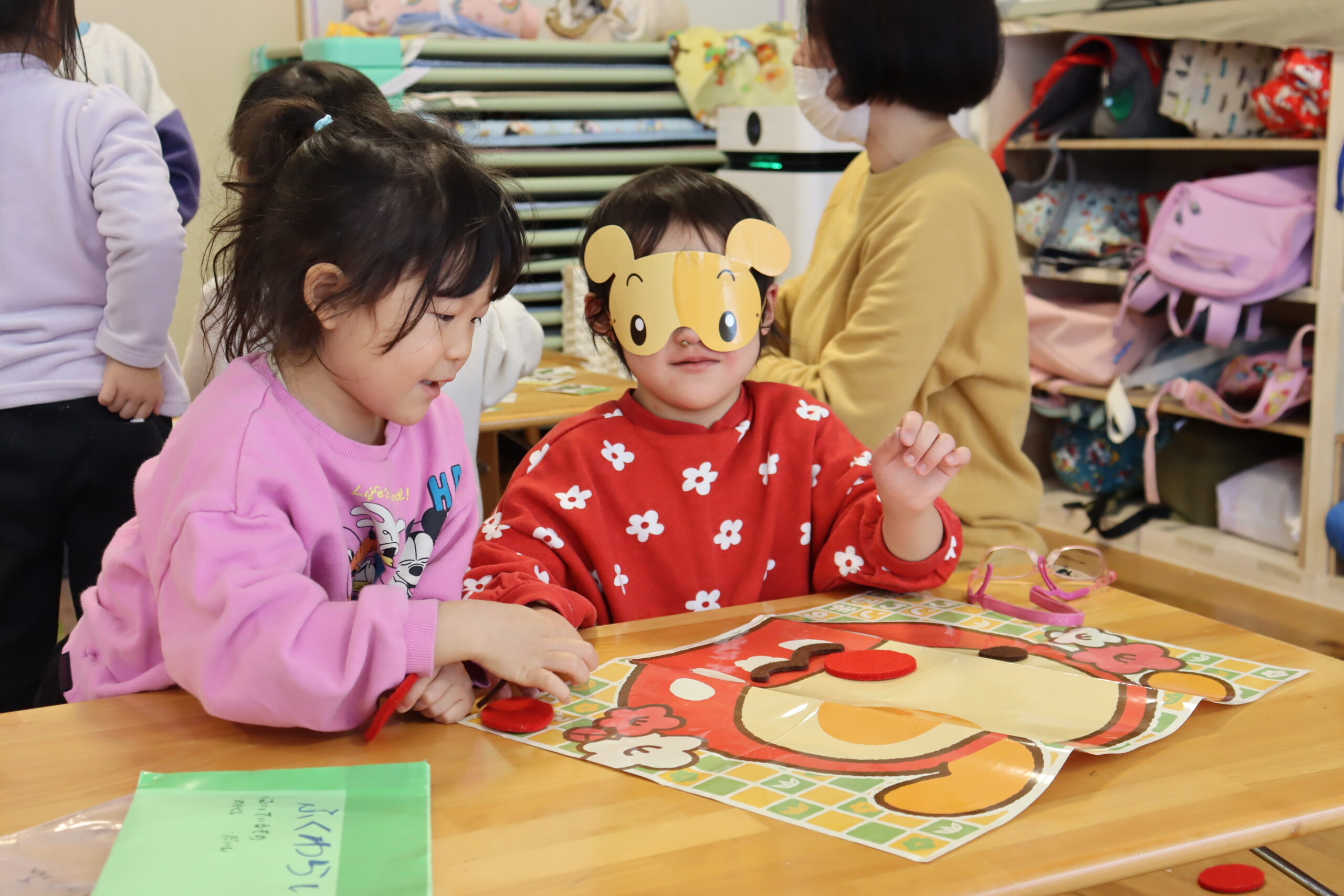 新年を迎え、保育者や友だちに「あけましておめでとう!」と元気よく登園してきました。