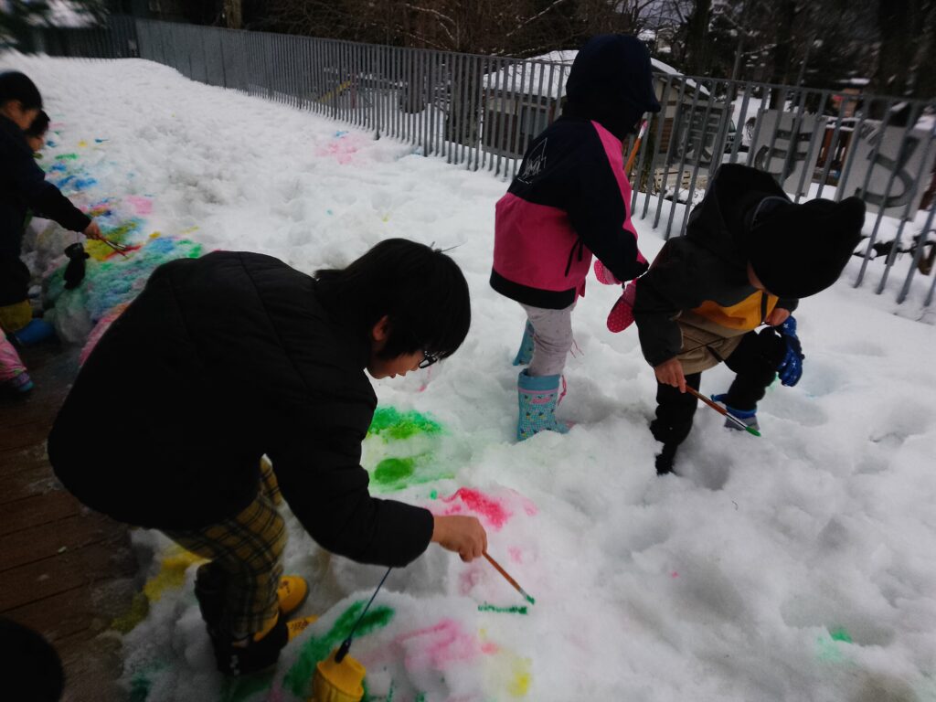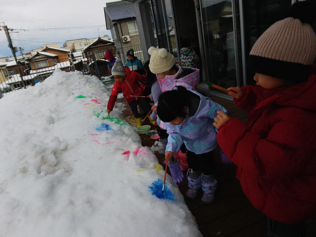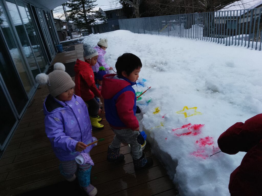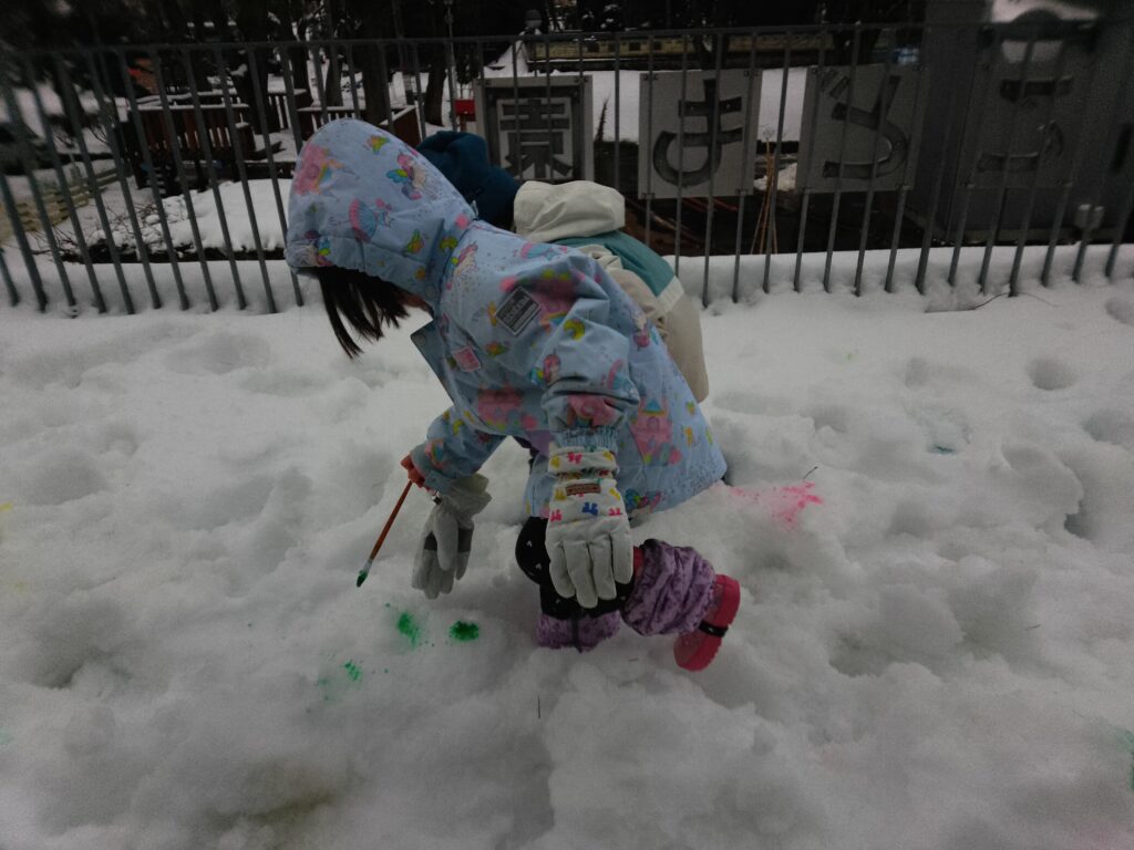 外の様子を部屋から見ながら、「いつ雪遊びする?」と、毎日戸外での雪遊びをとても楽しみにしていました。スノーウエアを身につけると嬉しそうにデッキの雪を触ったり、絵の具のついた筆でお絵描きをしたりしていました♪