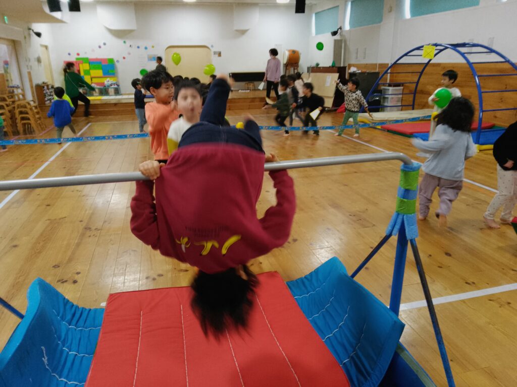 運動遊びの講師の先生から教えていただいた鉄棒の前回りなど、引き続き日常の遊びの中で楽しんでいます。ジャンプをしてお腹を鉄棒の上に乗せられるように、すぐに諦めず何回も並びに来たり、「見て!できた!」と嬉しそうに教えてくれたりと、挑戦した後の達成感を味わっています。😊