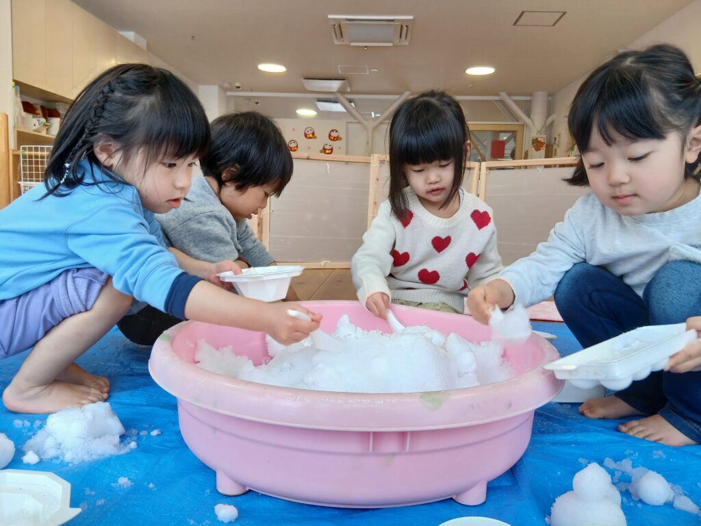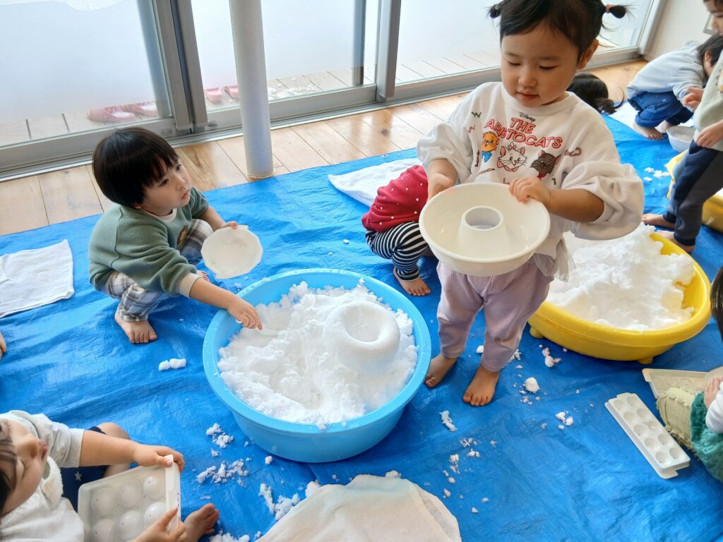 雪遊びでは、たらいに入れた雪を自分の好きな形の型に入れて、形の変化や雪の冷たさを感じていました。