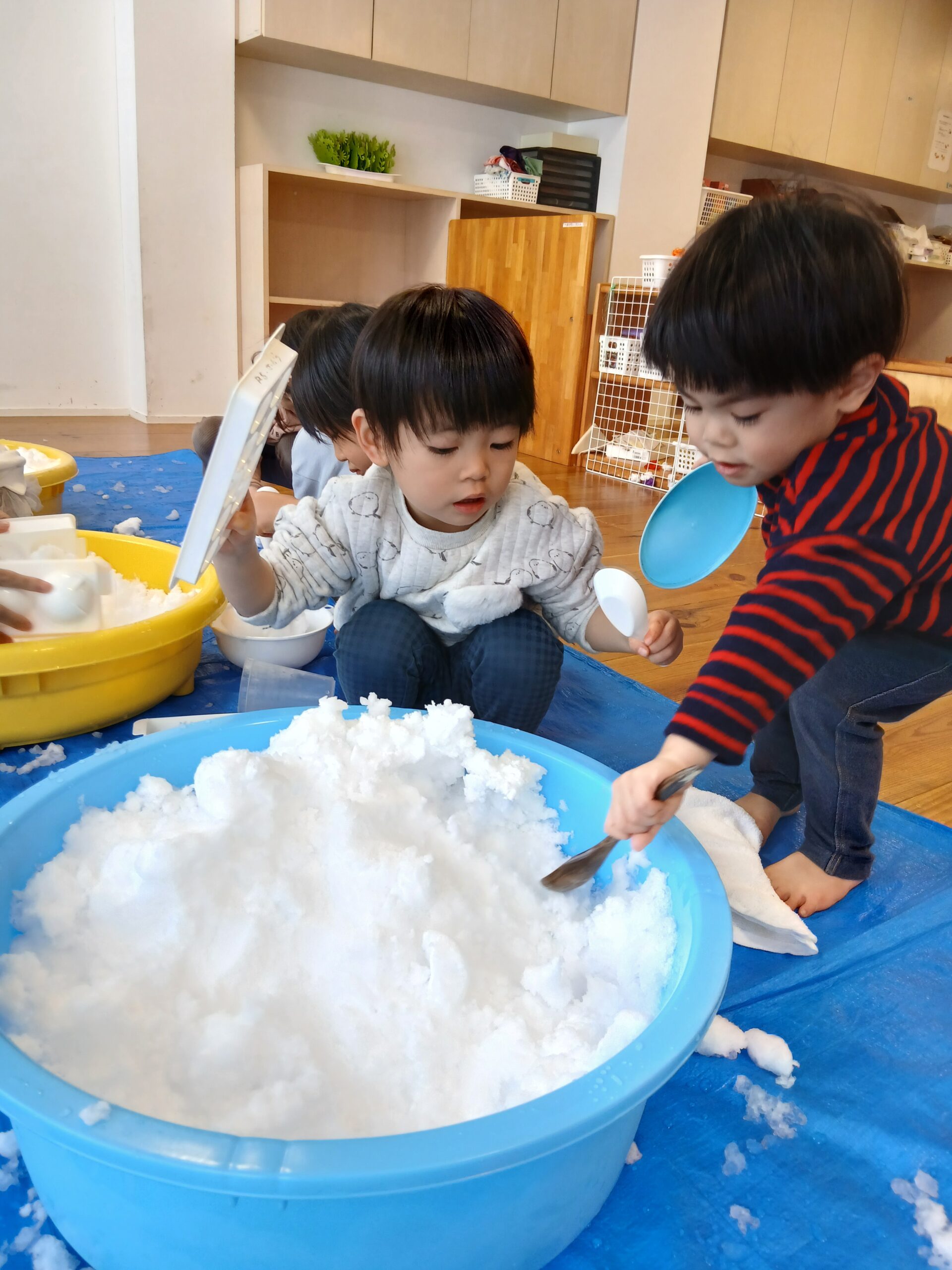 雪遊びでは、たらいに入れた雪を自分の好きな形の型に入れて、形の変化や雪の冷たさを感じていました。